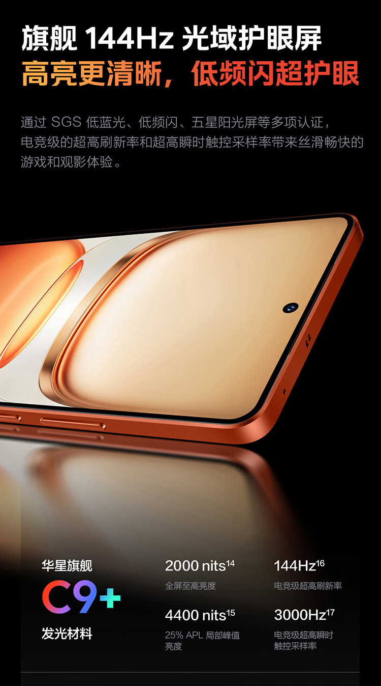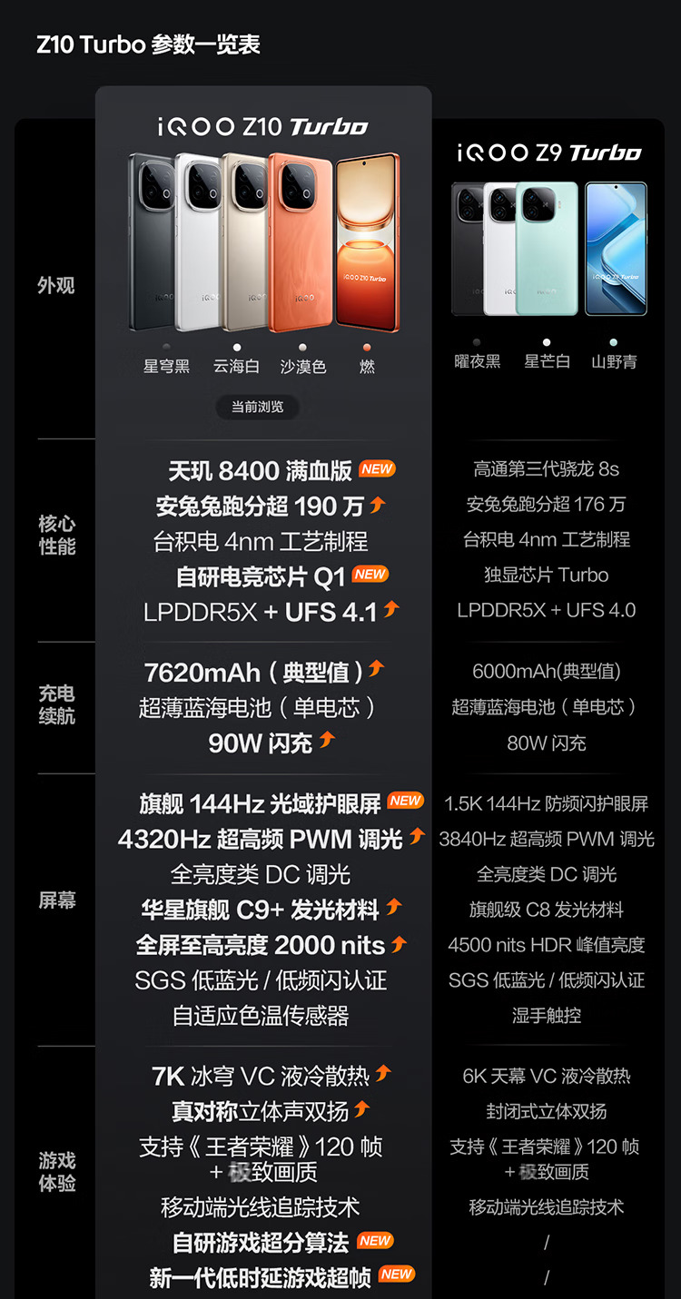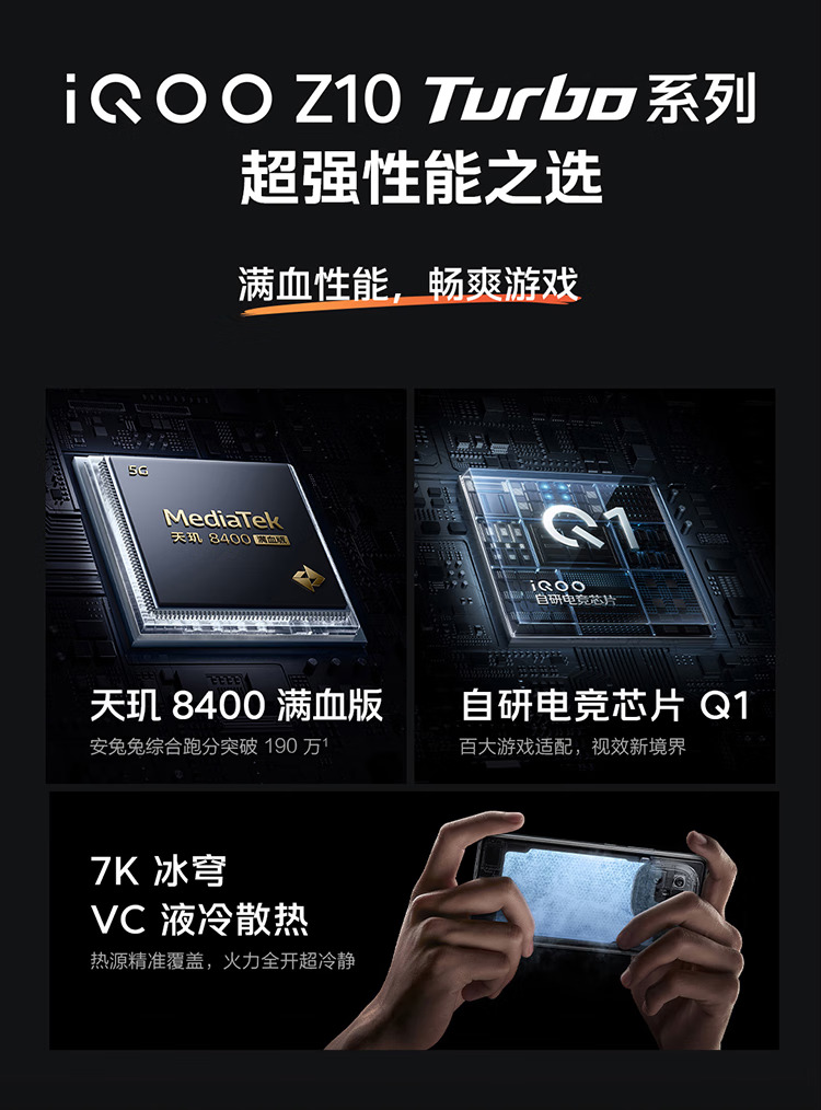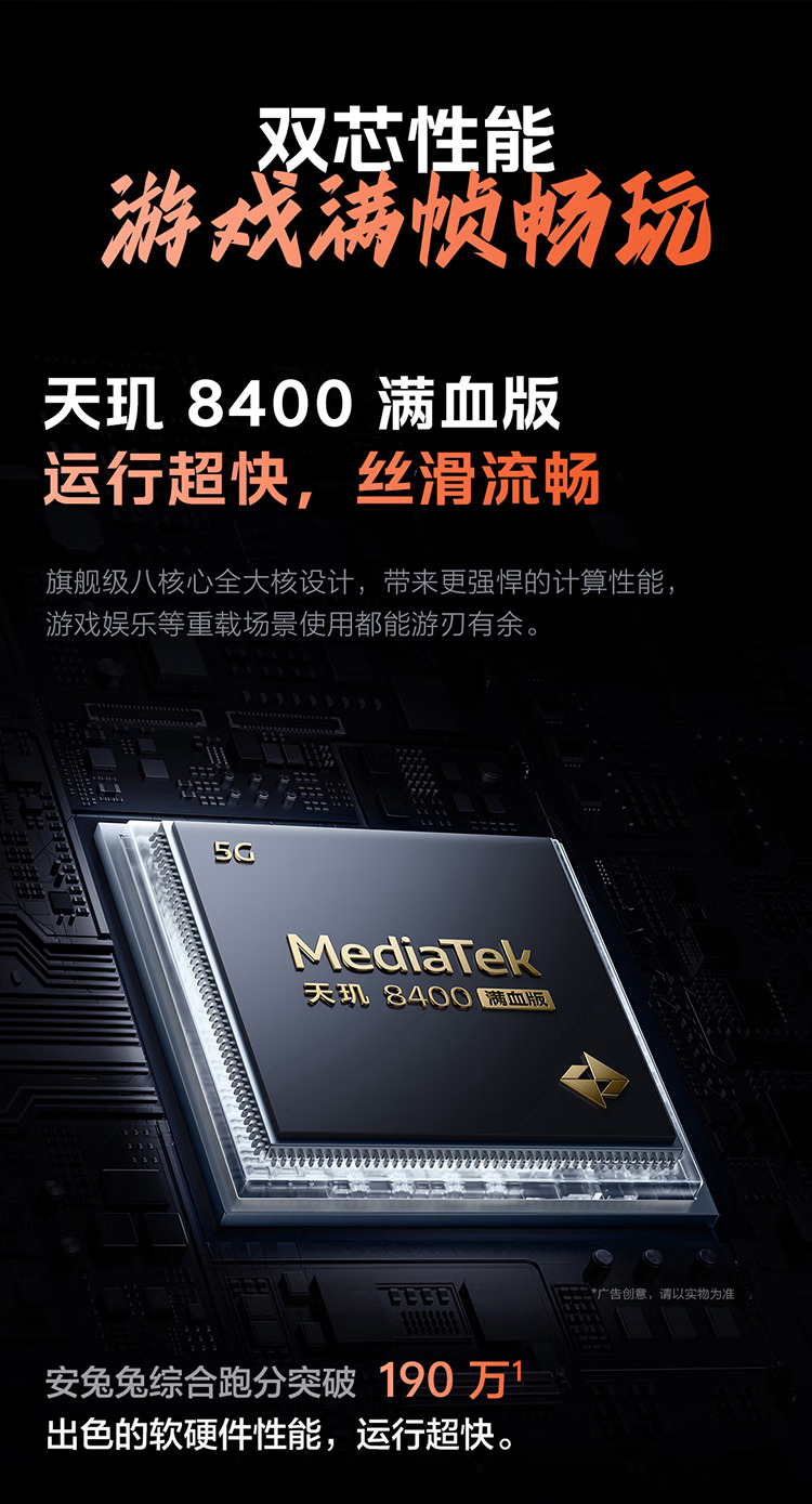 天玑8400满血版 · 自研电竞芯片 Q1 · 7620mAh超薄蓝海电池 · 旗舰144Hz光域护眼屏